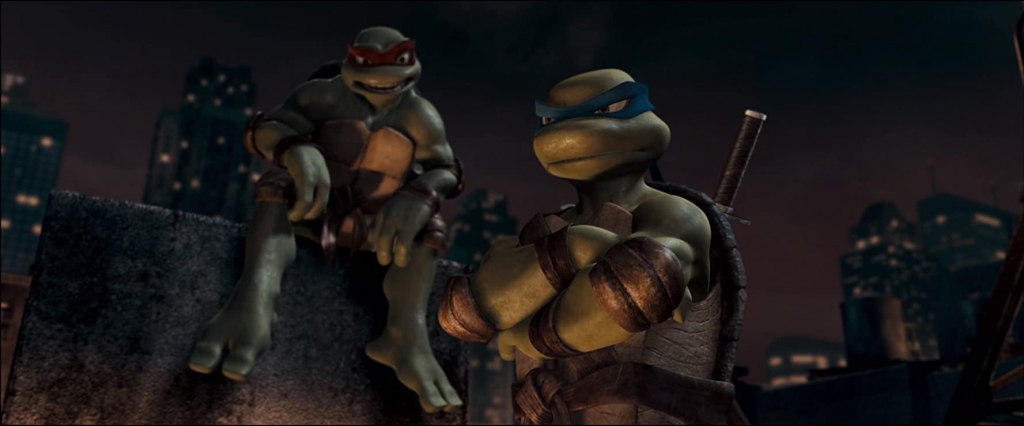 I will admit, the songs, like when Leo jumps out of a plane and returns to his home, as well as the soundtrack to the final fight, are very good. The plane soundtrack is also used in a 30-second epilogue scene narrated by Raph that is wonderfully animated and voiced, of the turtles running across the rooftops in the middle of the night and helping one another out when needed. The ending credit song of Shell Shock is also a groovy example of rap that deserves more recognition. Even if the models of the turtles are pretty much exactly alike, the rigging of their movements is more than good enough. So I guess the best way to explain my grade is this movie belongs to the action scenes. Whenever one isn’t going on and the characters are talking to each other, it’s like the dopamine is sucked right out of the room.